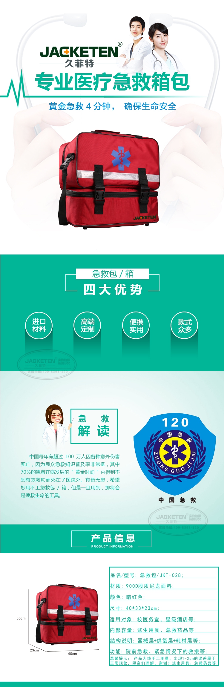 品名/貨號(hào):急救包/JKT-028;材質(zhì):900D股質(zhì)尼龍面料;顏色:暗紅色;尺寸:40*33*23cm;適用對(duì)象:校醫(yī)務(wù)室、星級(jí)酒店等;內(nèi)部容量:逃生用具、急救藥品等;結(jié)構(gòu)說(shuō)明:器械層+耗材層;功能:院前急救、緊急情況下的救援等